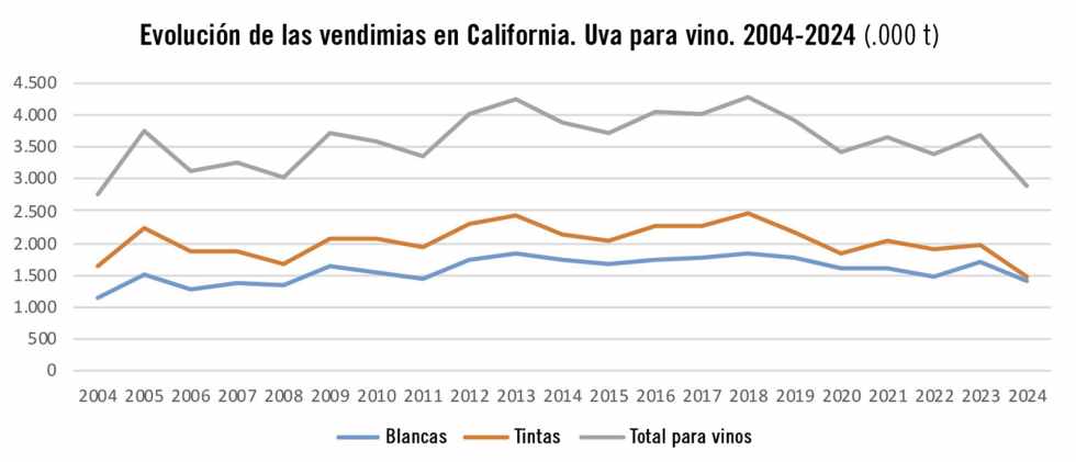 El informe de vendimia del Departamento de Agricultura de California (CDFA) ha confirmado que la de 2024 fue la vendimia más escasa en dos décadas. La uva para vino procesada en esta pasada recogida quedó en sólo 2,88 millones de toneladas, con un retroceso del 21,74% respecto a 2023 y sólo ligeramente por encima del dato de 2004 (2,78 Mt).