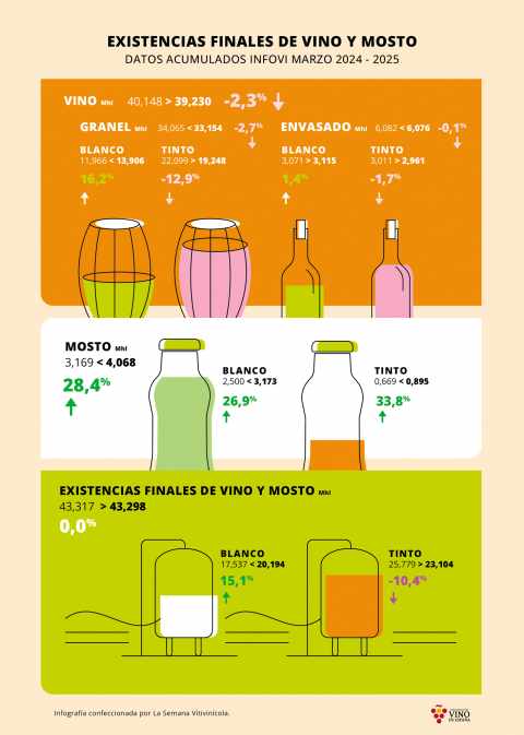 La siguiente infografía, ofrecida por la Organización Interprofesional del Vino de España (OIVE) recoge, de manera visual la situación de la campaña vitivinícola 2024/25 y la pone en contexto con la precedente, en lo relativo la situación de existencias de vino y mosto, en base al Informe Económico de Mercado - Datos Marzo 2025, que publica la Interprofesional.