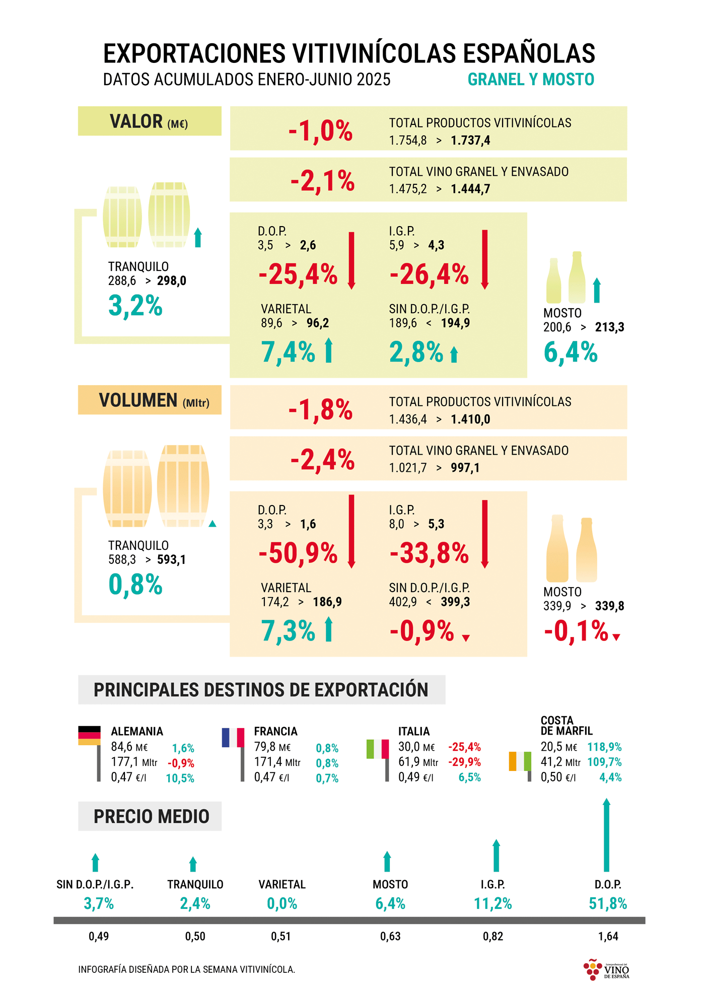La siguiente infografía, elaborada para la Organización Interprofesional del Vino de España (OIVE) recoge, de manera visual la evolución del sector exterior de los vinos a granel y mostos españoles en el periodo acumulado de enero a junio de 2025, respecto al mismo periodo de un año antes, en base al completo informe de exportaciones de OIVE/OEMV.