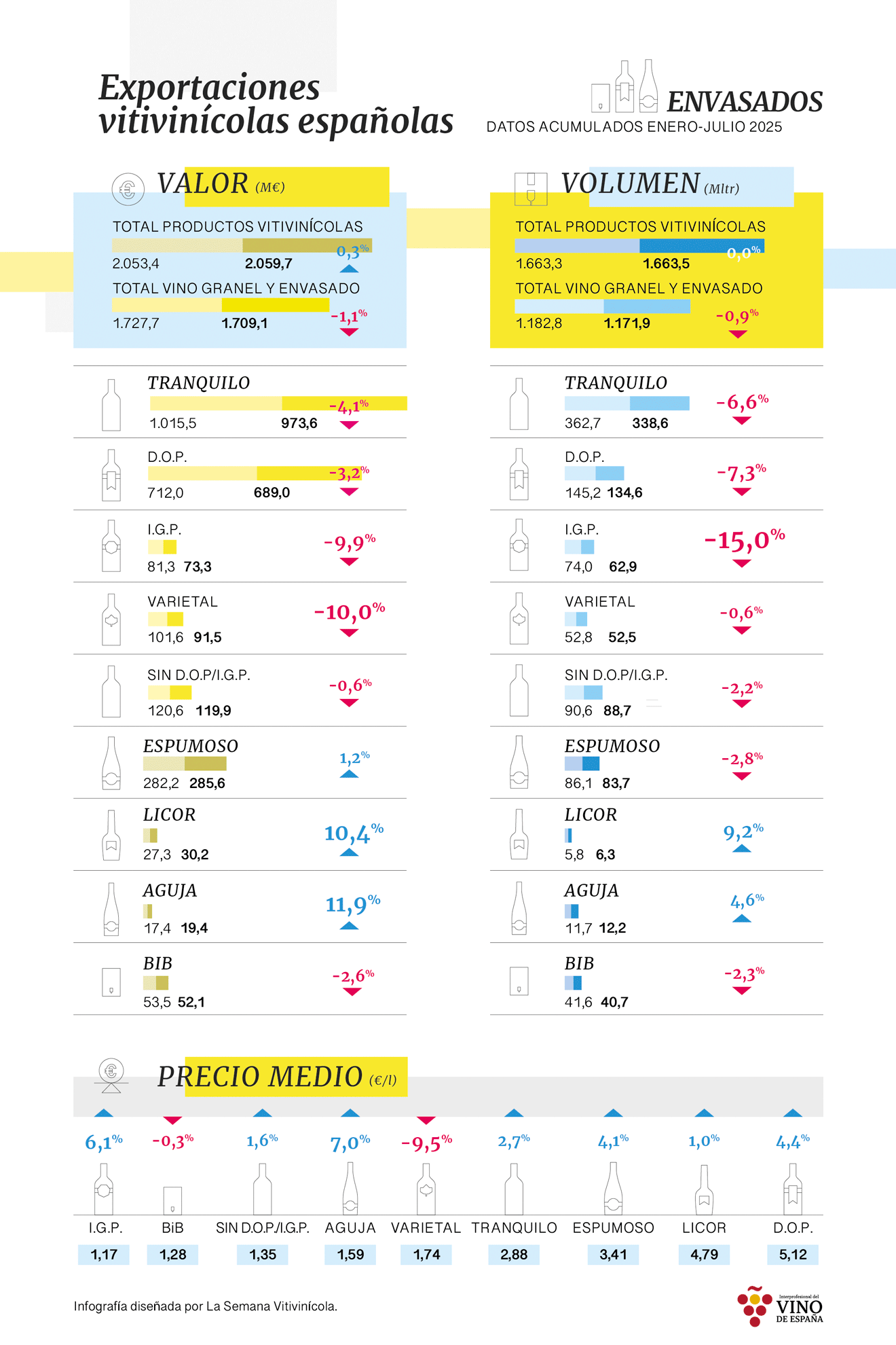 La siguiente infografía, elaborada para la Organización Interprofesional del Vino de España (OIVE) recoge, de manera visual la evolución del sector exterior de los vinos envasados españoles en el periodo acumulado de enero a julio de 2025, respecto al mismo periodo de un año antes, en base al detallado informe de exportaciones de OIVE/OEMV.